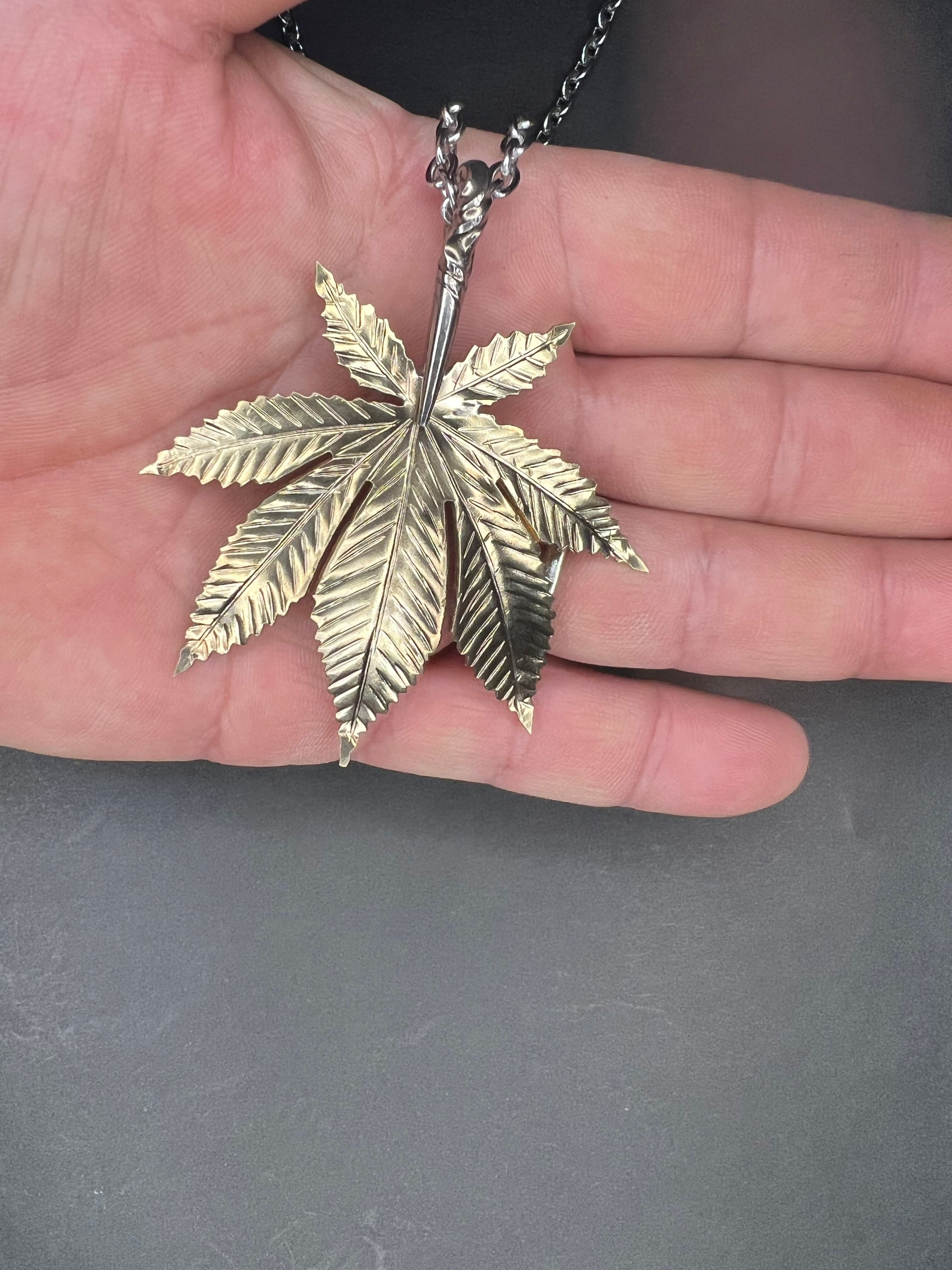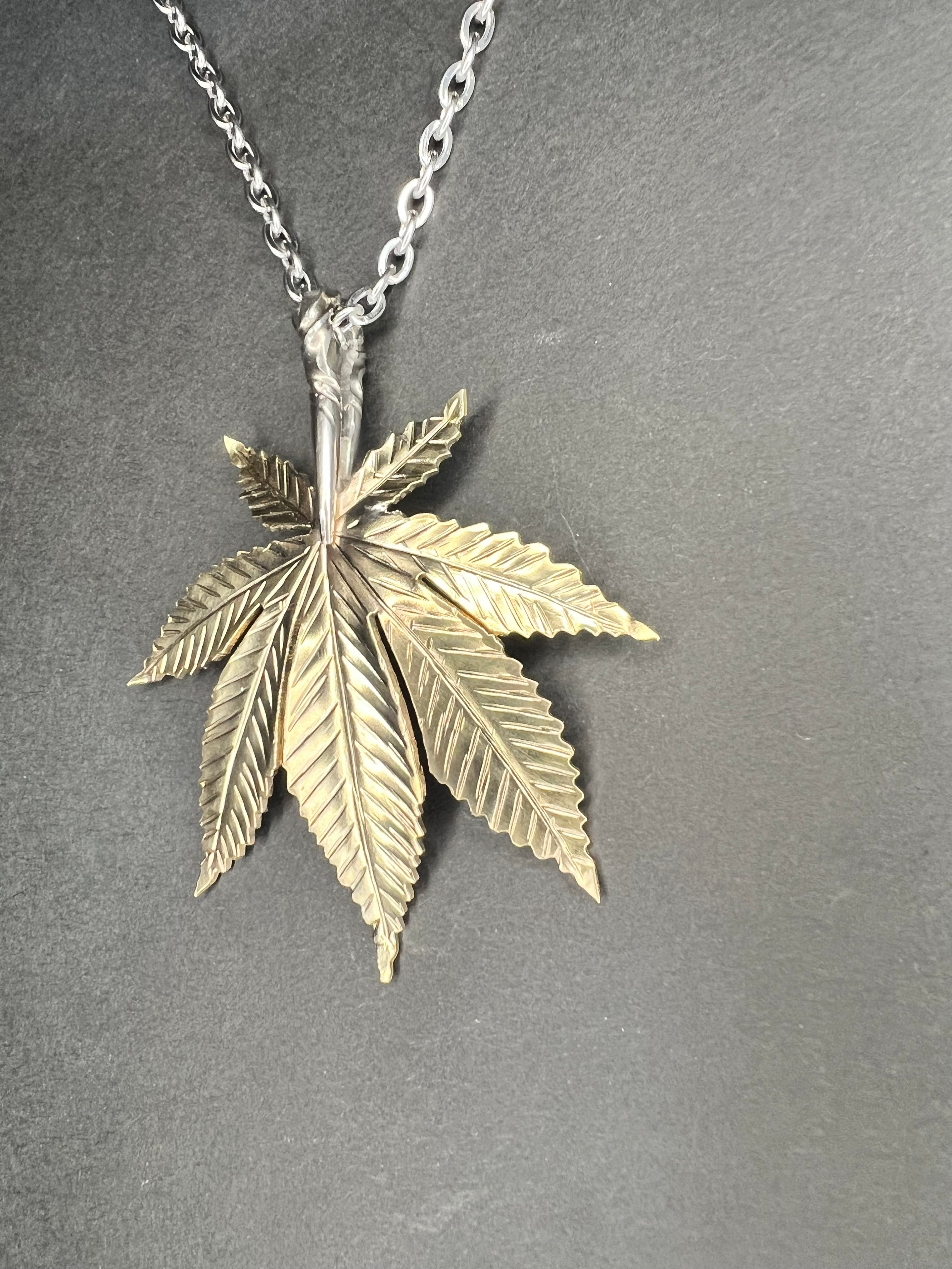 ハンドメイドにて、スーパーリアルに切り出したガンジャリーフをステンレスのツイスト加工したチェーンループにロウ付け、